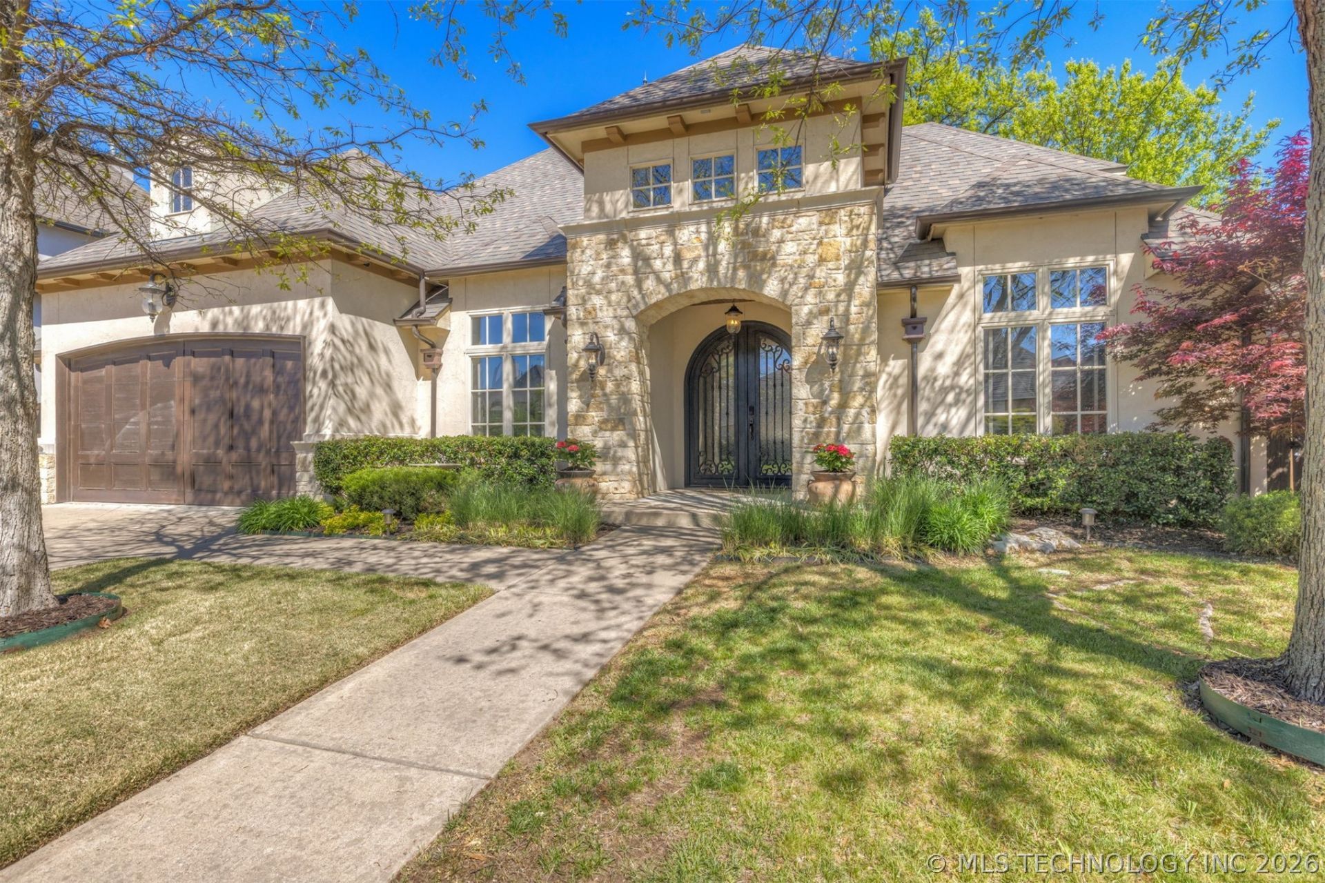 Stunning custom home built by Hollinger in gated Scissortail at Wind River. Grand Entry with Custom Iron Double Doors. Solid wood floors throughout the main floor. Private office with built ins, french doors and picture window. Chefs kitchen with custom cabinets including pull out spice racks and walk in pantry. Generous Living room with wall of Cathedral windows and fireplace overlooking a resort style pool & manicured landscaping. Screened in Patio. Guest suite with private bath on main floor. Large Powder room and Laundry. Primary suite with spa shower and 3 walk in closets. Landing gameroom with hall bath plus 2 bedrooms, home theater and exercise room or climate controlled storage. Features include custom trim work, smart switches, custom tile, and storm shelter. Heated Lautner knife-edge pool and hot tub with integrated fountains and waterfalls. New A/C July '24, New roof/gutters September '24. New HVAC 2025. Nestled amongst mature trees in a gated community with access to a neighborhood pool and a fishing pond. Jenks Southeast Elementary.