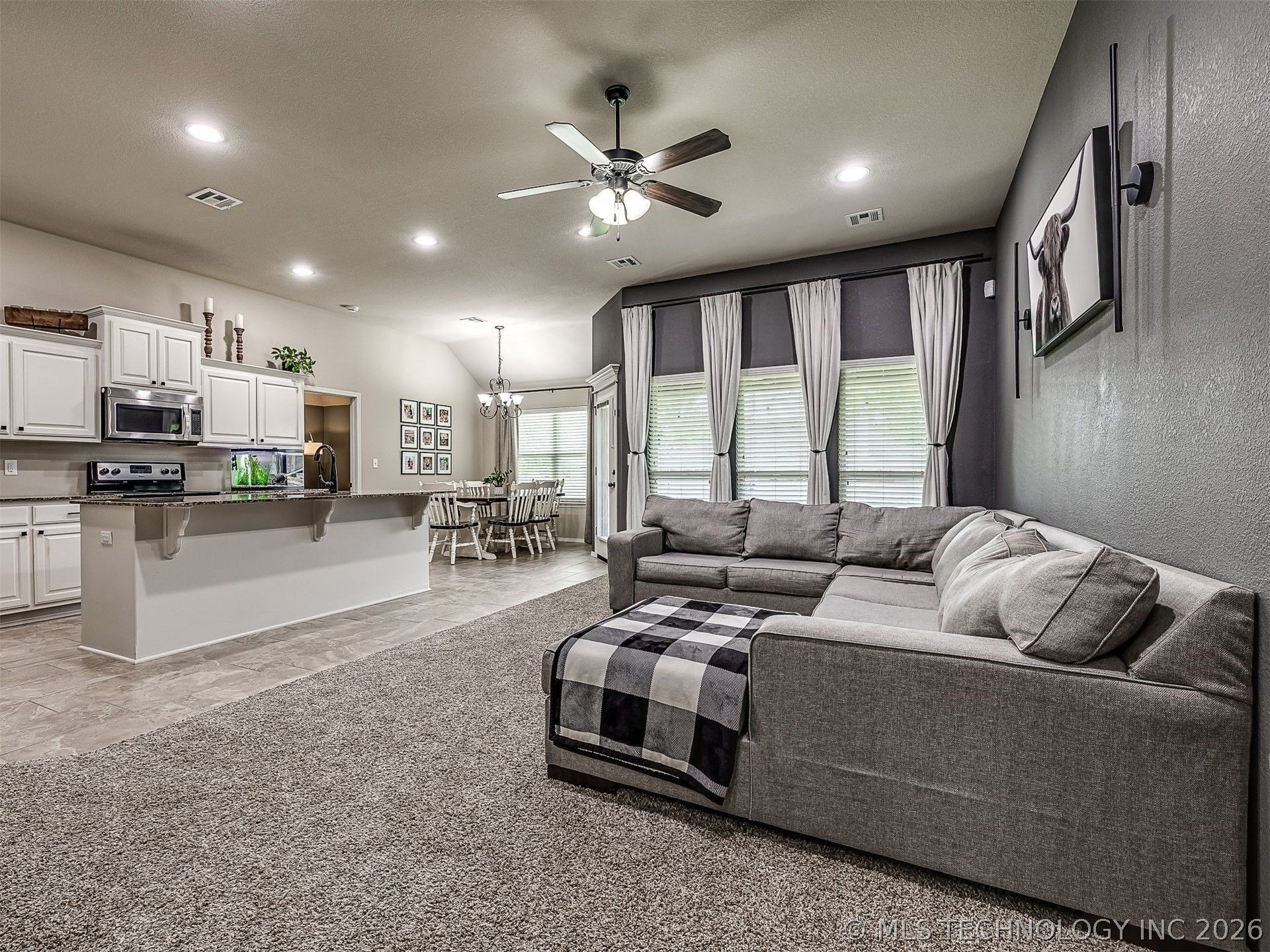 MOVE-IN READY! Exceptional home with fantastic floor plan in quiet, established neighborhood! Spacious living room with great natural light opens to large kitchen with tons of white cabinets, granite counters, large center island with bar seating and stainless steel appliances, plus sunny dining area! Coveted split bedroom plan features large primary suite with high ceilings, private bath with double vanities, soaking tub and separate shower, plus fantastic closet! Auxiliary bedrooms have great closets and close access to large hall bath with shower/tub combo, double sinks and tons of storage. Neutral, on-trend paint and flooring throughout. Covered back patio looks to fully fenced yard. Property also includes a storm shelter for added safety.