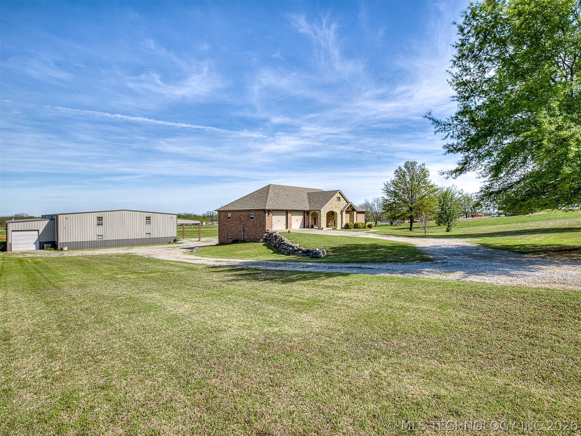 What if every trip home ended like this? After landing at SkyHaven Airpark (OK010) on the 4,400' grass runway, taxi straight to your own private retreat-situated on over 2 acres with a beautiful home! The property also includes a 60'x100' hangar with a 50' hydraulic door, a 25'x50' climate-controlled shop, and an approximately 1,300 sq ft full apartment above-perfect for guests, rental income, or a pilot's retreat. Step inside the home and you're immediately welcomed by beautiful custom wood finishes and a spacious, inviting living area. The kitchen is designed to impress, featuring custom hickory cabinetry, granite countertops, and a stunning granite farmhouse sink. It opens seamlessly to the dining area, where you can take in incredible runway views. The primary suite offers a spacious layout with custom finishes, a large walk-in closet, and a luxurious bathroom complete with heated floors, dual vanities, and an oversized walk-in shower. An additional guest bedroom on the main floor includes a walk-in closet and access to a full bathroom with heated floors and a soaking tub. Downstairs, the full walk-out basement provides even more living and entertaining space. You'll find a large living area with a built-in pellet stove fireplace, a guest bedroom with a full bath, a spacious office with a closet, an additional living area, a 300+ sq ft storage room (not included in square footage), a saferoom, and a single-car garage for additional vehicles or toys. No expense was spared in the construction of this home, including 10-inch concrete basement walls, extensive custom finishes throughout, and a recently installed new roof. Enjoy watching airplanes from your balcony, relaxing around the firepit, or soaking in the hot tub-all while taking in the incredible views. This is more than a home-it's a lifestyle.
