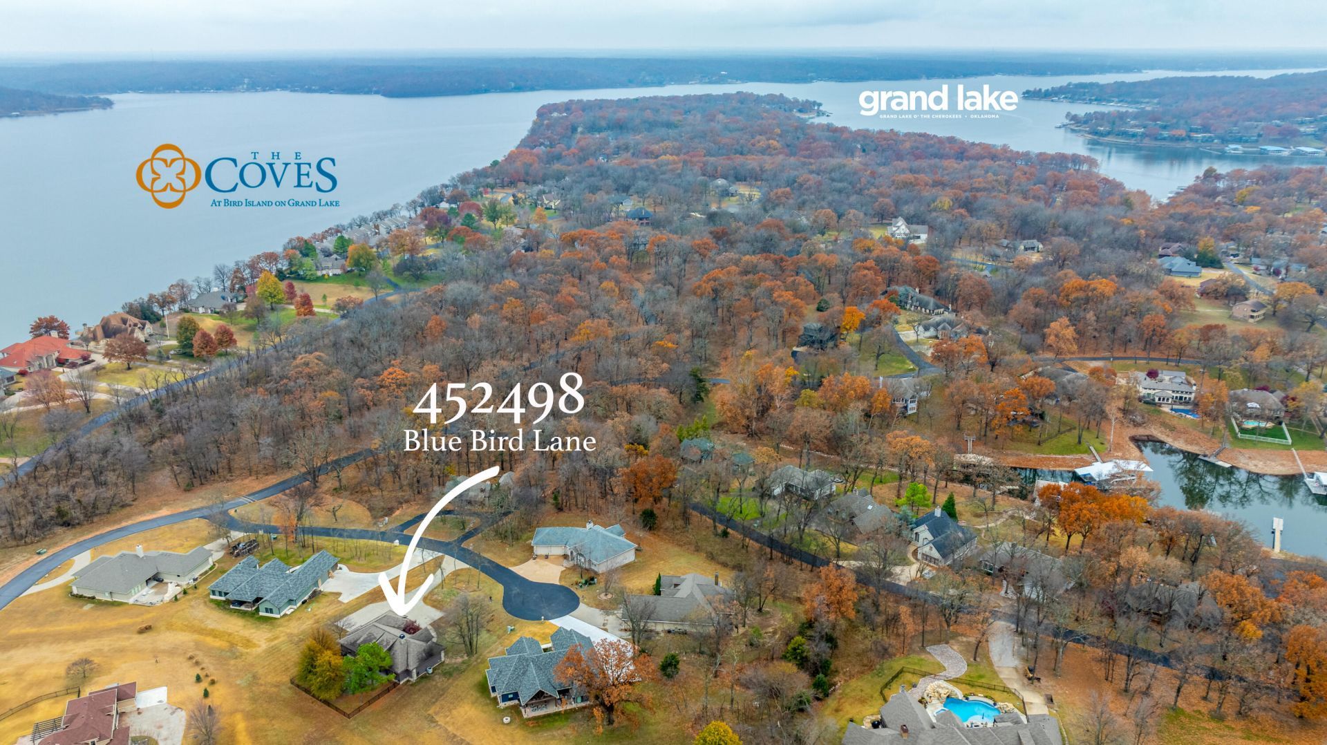 Prime location on Grand Lake, near all of the action! This beautiful home offers a perfect blend of rustic charm and modern updates. The open-concept living area features kitchen w/ island seating, separate dining area & full pantry. The living room offers a fireplace flanked by built-in shelves. The split floor plan offers 3 beds and 2 baths including primary suite w/ dual vanities, walk-in closet & separate shower and bath. Plenty of outdoor space to entertain w/ partially covered patio, large rock firepit, + new iron fencing . The Coves at Bird Island is a gated lake community with 24/7 manned security, 18-hole golf course, swimming pool, tennis courts, community dock and located near several restaurants & marinas for endless recreational opportunities.