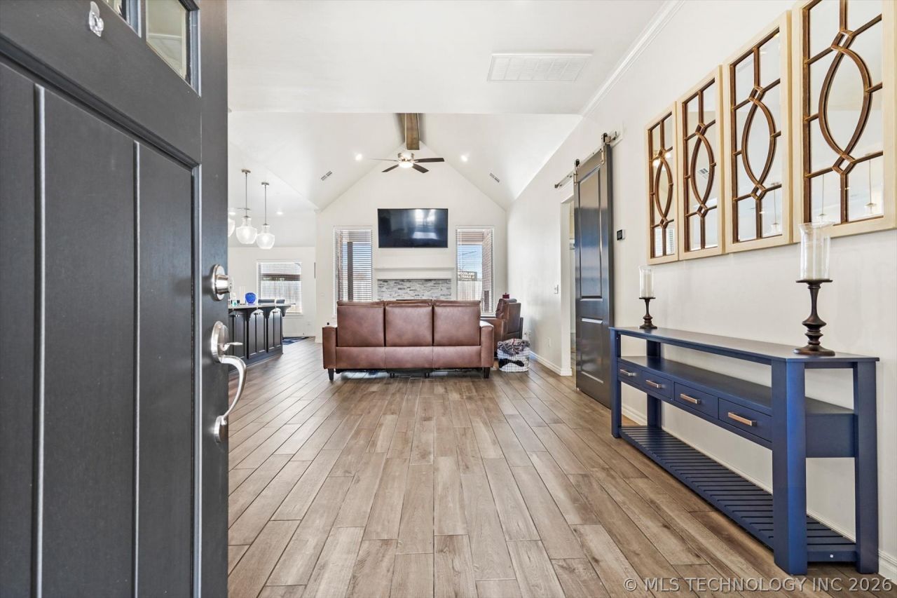Motivated Seller -- This home is a beauty! Built late 2022 on a premium corner culdesac lot, this home offers 4 bedrooms, all downstairs, 3 full bathrooms, 2 covered patios, a utility room connected to master closet, 2 wood blinds throughout, and a huge bonus room! Oversized bonus room could be made into 5th bedroom with 3rd bathroom suite. Living room features an outstanding cathedral ceiling, breathtaking fireplace, beautiful crown molding, a ceiling fans, and large windows framing the perfect amount of natural light. The kitchen includes all stainless-steel built-in appliances, well-crafted cabinets to the ceiling, 3 CM quartz countertops, a large corner pantry, under cabinet lighting, stellar pendant lighting, a large center island perfect for family to gather & centerpiece as host. The primary suite boasts a huge walk-in closet, tall seasonal storage, a double sink vanity, a Jetta Whirlpool tub & walk-in shower! The fun continues outside with your covered back patio featuring a wood-burning fireplace, TV hookup, additional gas line perfect for the grill master in you! Lush corner culdesac lot includes a sprinkler system and completes the energy-efficient home, home air purification system, double-glazed vinyl low E windows with argon, R-15 and R-44 Insulation, inground storm shelter, tankless water heater! Make this honey of a house your next Home Sweet Home!